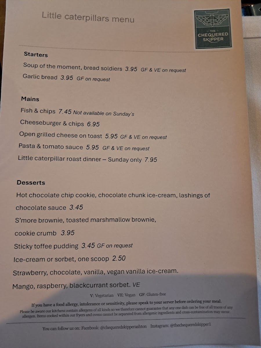 From a reviewer’s perspective, the menu at The Chequered Skipper Pub & Restaurant feels like a thoughtful summary of classic pub comfort food with a welcoming, family-friendly twist. The starters set a relaxed tone, with simple, warming options such as Soup Of The Moment, Bread Soldiers, and Garlic Bread, ideal for easing into the meal. Moving on to the mains, the kitchen leans confidently into well-loved favourites: Fish & Chips delivers that traditional British pub experience, while Cheeseburger & Chips offers familiar satisfaction. Lighter or younger appetites are also considered with dishes like Open Grilled Cheese On Toast, Pasta & Tomato Sauce, and the playful Little Caterpillar Roast Dinner, showing an inclusive approach to diners of all ages.