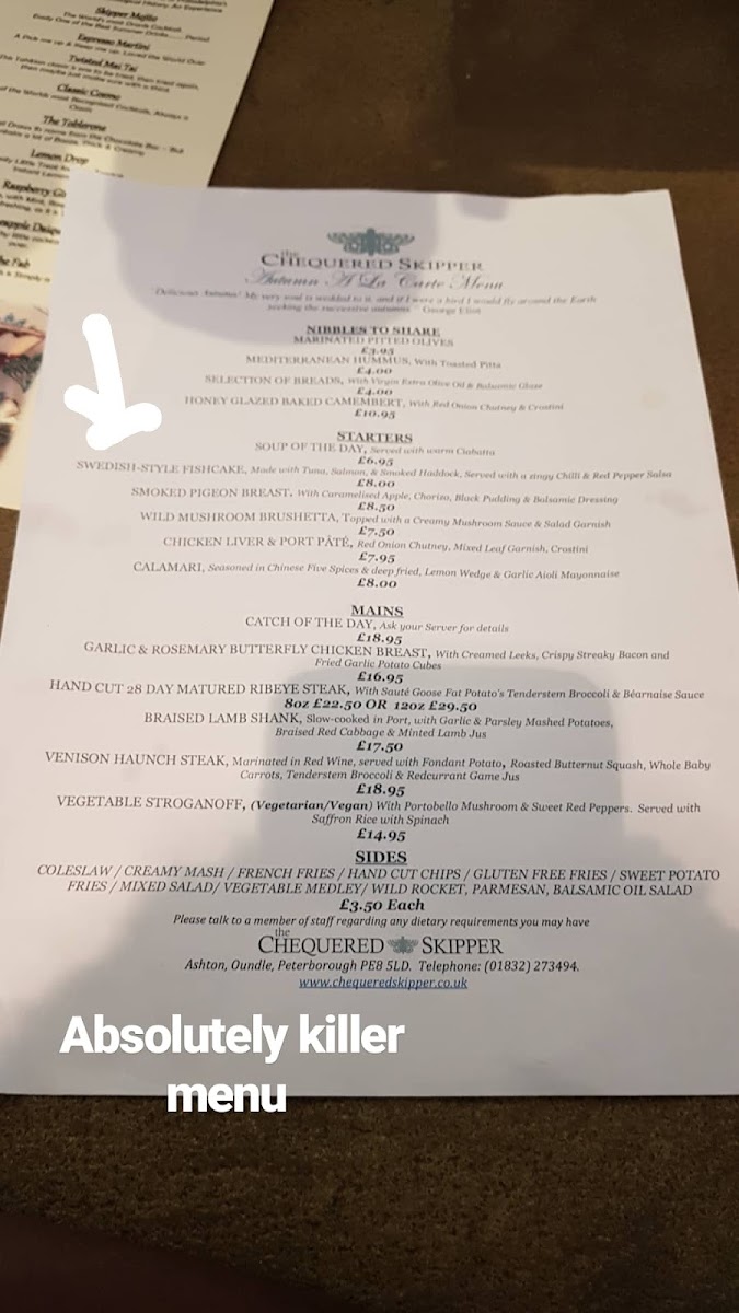 Overall, the menu at The Chequered Skipper Pub & Restaurant comes across as reassuringly familiar yet carefully balanced, offering something for everyone and neatly tying together hearty mains, indulgent desserts, and versatile smaller plates into a satisfying pub dining experience.
